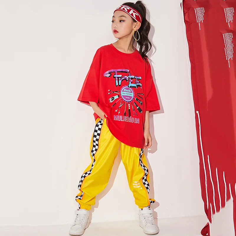 Hip Hop Costumes Kids Loose Red Short Sleeve Yellow Pants Street Dancing Clothes Boys Rave Outfit C